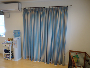 シャープで冷たい印象になりがちなブルーのストライプ生地が、やさしく、あたたかい雰囲気のカーテンに仕上がりました。