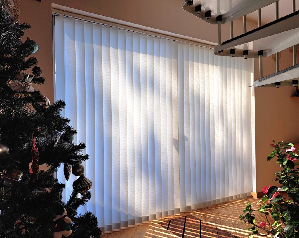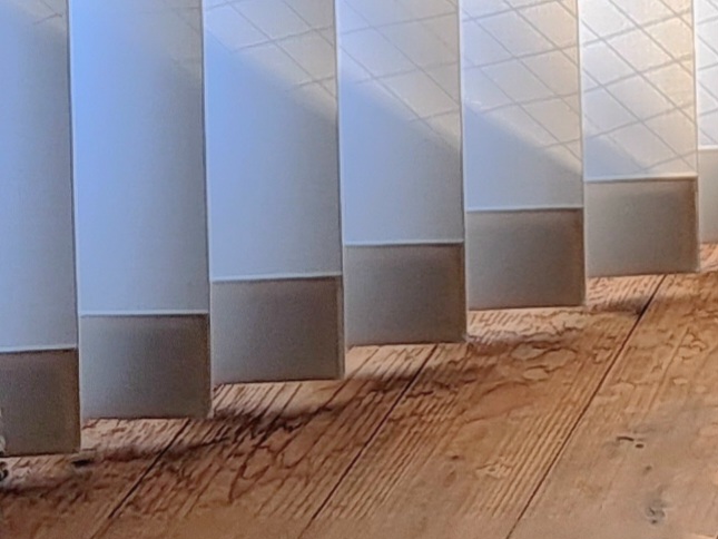 バーチカルブラインド ニチベイ アルペジオ(ルーバー100mm) 裾はスッキリした仕様のミニマルスタイル(オプション)。 操作は両サイドから開閉の出来る両バトン式仕様。実はかなり使い勝手が良い優れものです。