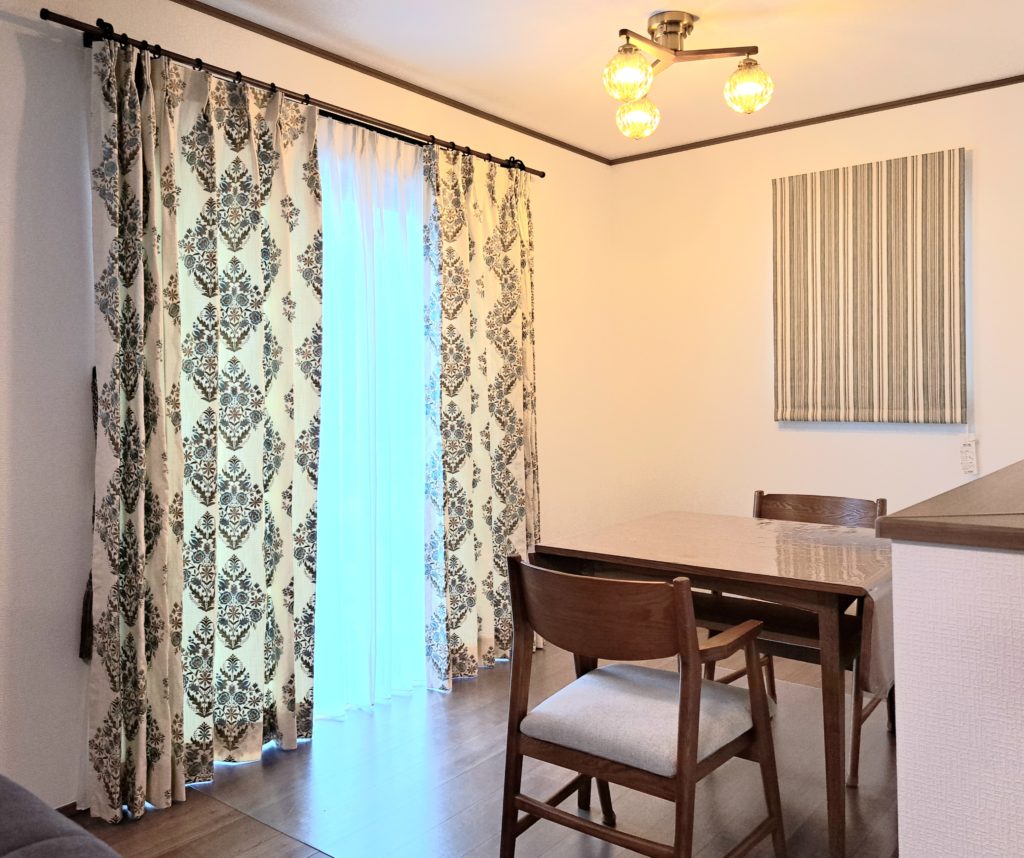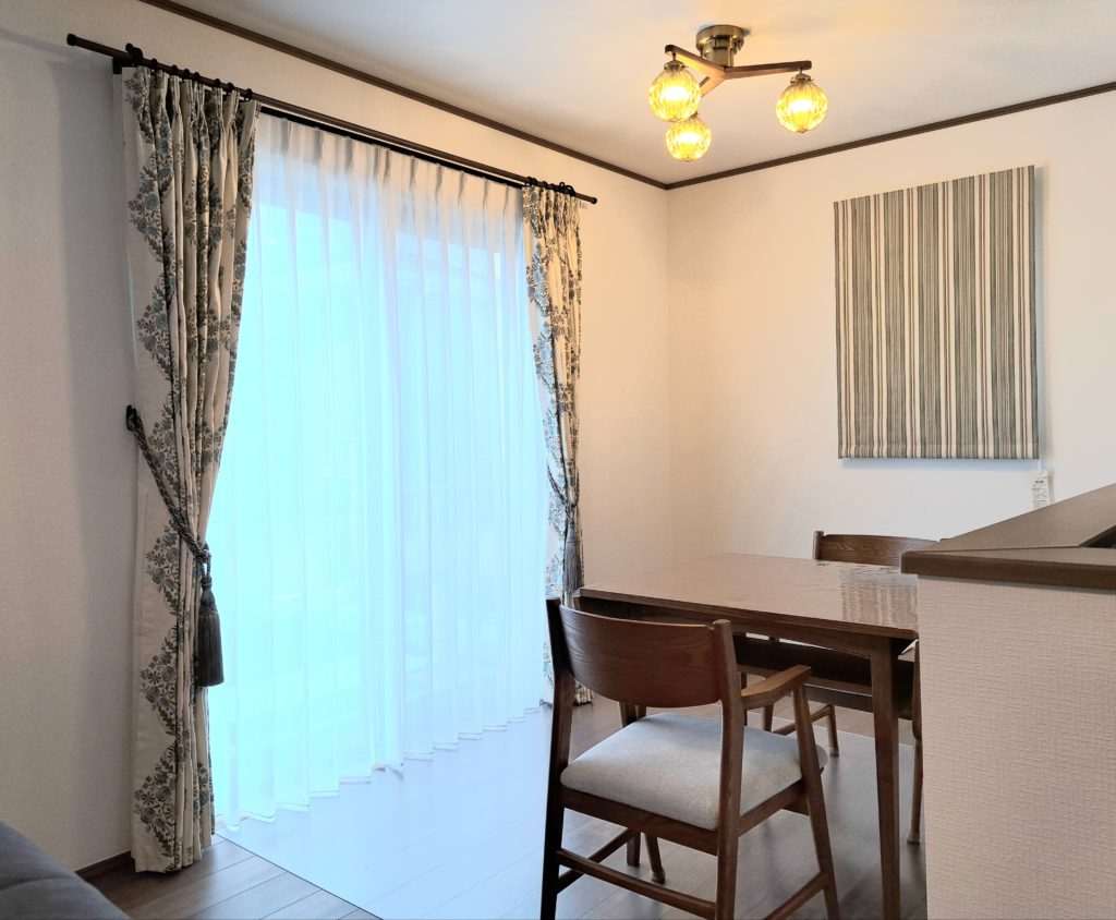 ご新築リビングのカーテンを模索していたお客様が当店でイメージはまったコーディネートに出会っていただきました。