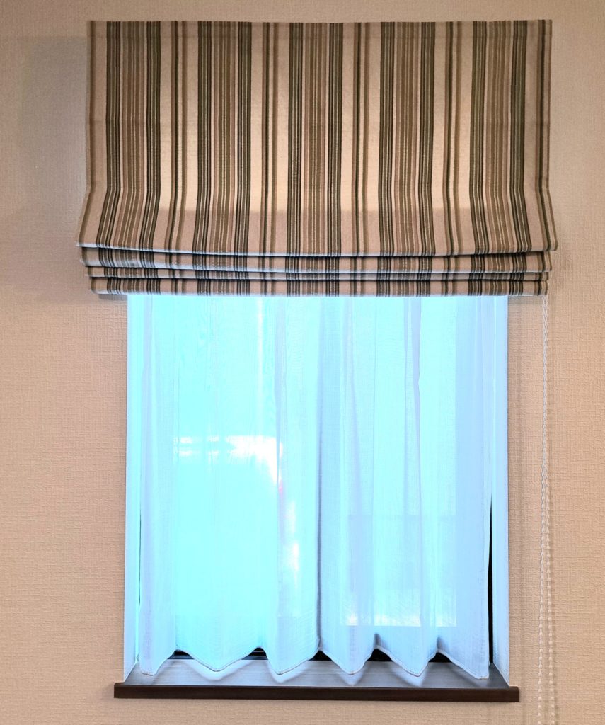ローマンシェードはドレープカーテンに使ったDevonの配色に合わせたkiyarn ASPLEY STRIPEをチョイス!