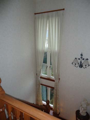 階段の踊り場の窓にカーテンを取り付けました。 機能重視で、ロールスクリーンやブラインド等もありますが、 やはり、カーテンは味があって良いなと思いました。 取り付け高さ(カーテン)が、3m50cm~60cmあったので少し大変でしたが とても綺麗に仕上がり、美しく収めることができました。